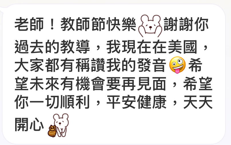 “老師!教師節快樂。謝謝你過去的教導,我現在在美國,大家都有稱讚我的發音。希望未來有機會要再見面,希望你一切順利,平安健康,天天開心”